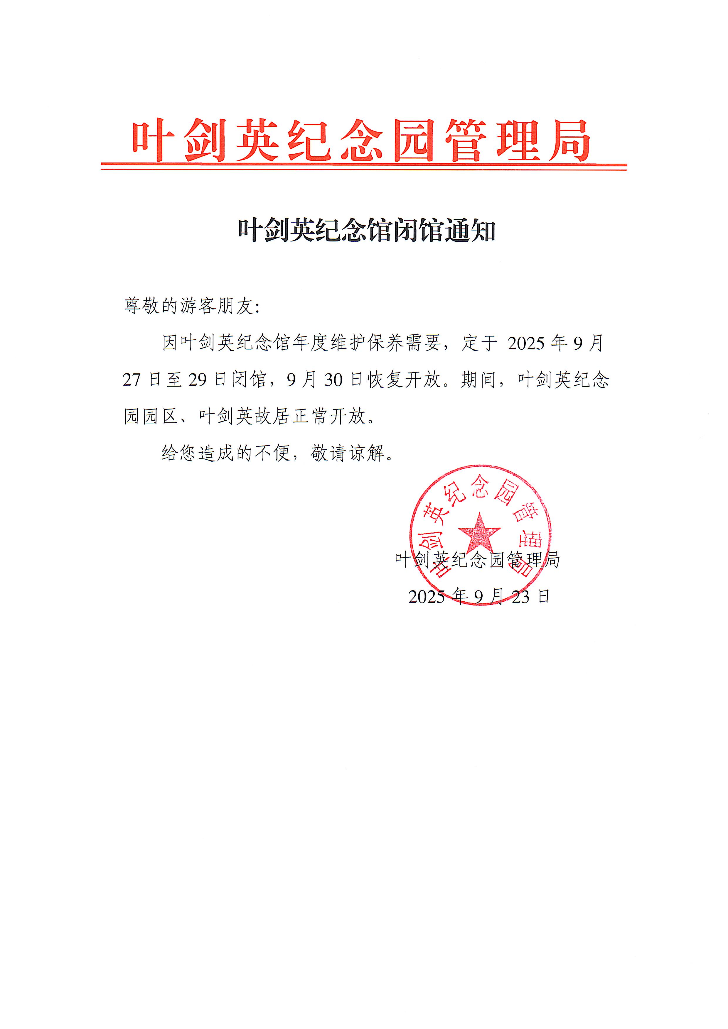 叶剑英纪念馆闭馆通知